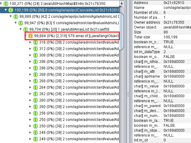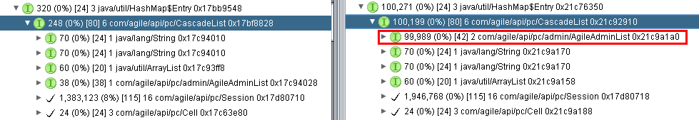 Definitely, each object in 9.3.0.3 consumes more memory than 9.3.0.1. Let’s capture one attribute [General Info.Department] to analyze. “Department” is a List type, of course we do not care it is common List or Cascade List. Compare this attribute between two version we will see the big difference and confirm there is a big object (com/agile/api/pc/CascadeList) in 9.3.0.3 which consumes 100, 199 bytes, 9.3.0.1 consumes 248 bytes only.