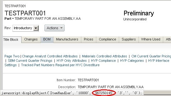 To get which row in page_two table, next we shall get this TESTPART001’s ID first. There is a very quick way: put your mouse pointer on any tab of that part, you will get a hint of Javascript in browser’s status bar. In this example, this TESTPART001’s ID is 967250145.