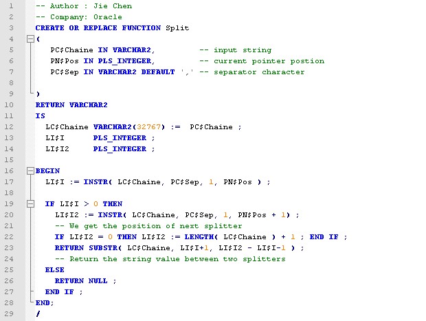 As there is no existing SPLIT function or related in PL/SQL, I should program it by myself. I code Split intermediate function which is used to get the token value between current splitter and next splitter.