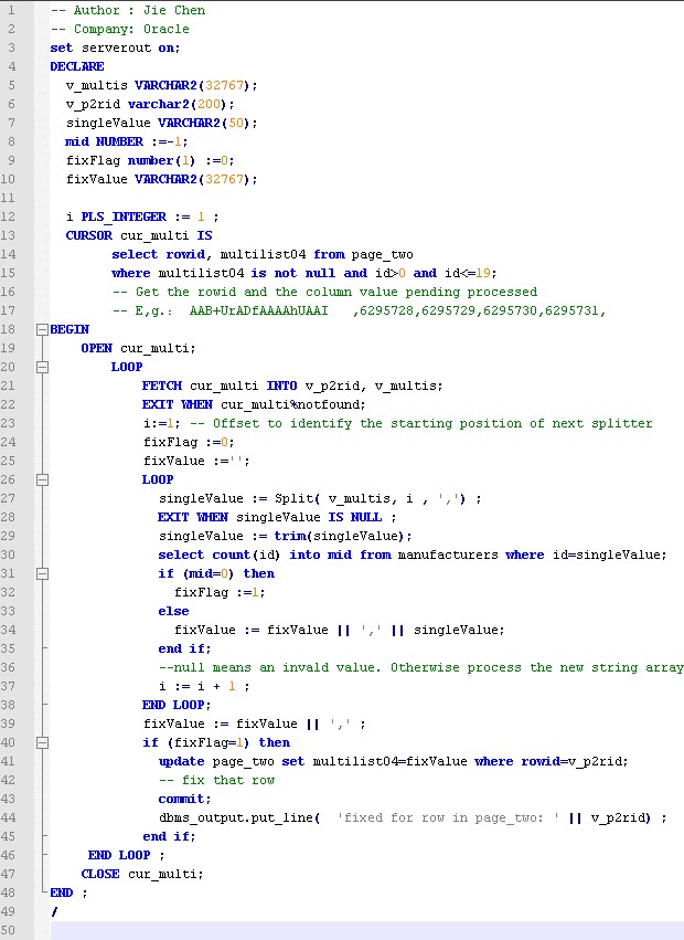 Next program is main entry point, it get each column value from page_two.multilist04, process each row based on cursor. When it get each multilist04 value, it uses above Split function to get each token string stored to singValue variant, then check if it exists in manufacturers.id. If not found, set fixFlag to 1, pending to be deleted.