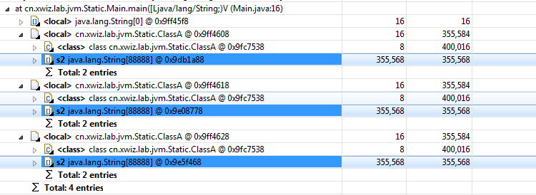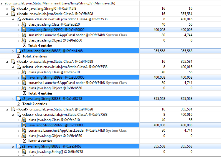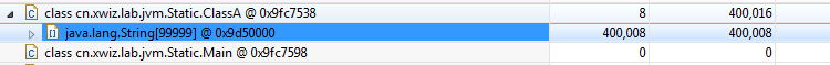 但是三个实例并没有列出那个99999的字符串数组。它肯定不再heap堆中,因为它在方法区中。注意看cn.xwiz.lab.jvm.Static.ClassA前面的”class”标识字符。