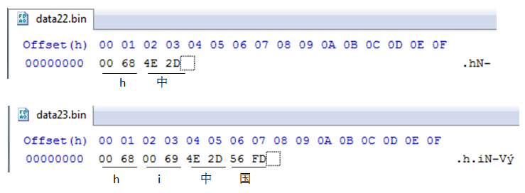 在这2个文件中,可以看到“中”被完整地保存为4E2D,而字符“h”则表示为0068,实际上只要一个字节即十六进制的68就能标识。0属于空间浪费。