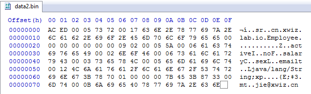 - 63 6E 2E 78 77 69 7A 2E 6C 61 62 2E 69 6F 2E 45 6D 70 6C 6F 79 65 65: 实现序列化的类名cn.xwiz.lab.io.Employee