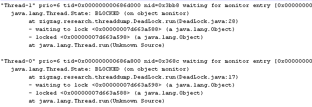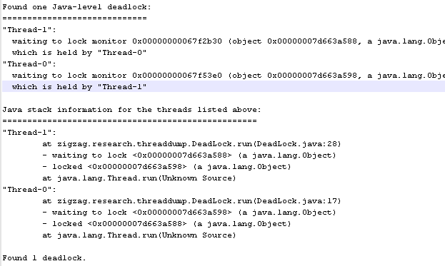 死锁很容易被Thread Dump识别,不需要人工分析。下面的Dump输出就是。