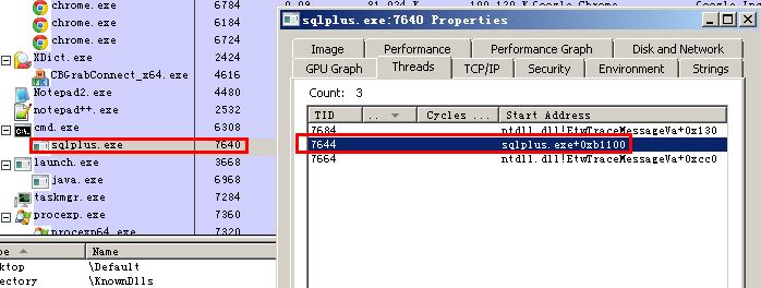其中Client_OSPID在windows环境中显示为7640:7644的格式,如果是Unix,将显示一个独立的整数作为SQLPLUS进程。在Windows上,7460为SQLPLUS的进程,7644为其中的线程。我们可以使用Process Explorer观察到。