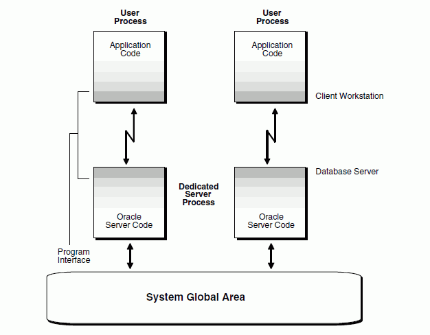 Oracle所默认的即是专注模式下的服务进程,观察下图可知一个Server Process为一个用户进程服务。