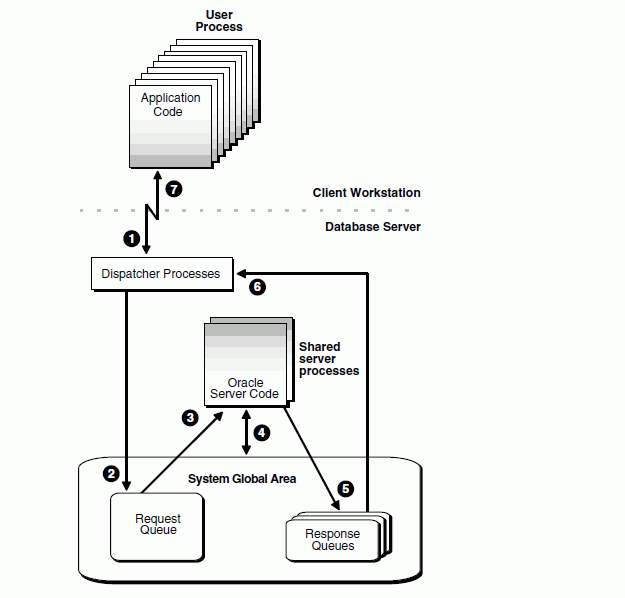 在共享模式下,Oracle维持一定数量的服务进程,并指派当前处于闲置状态的服务进程响应队列中的用户请求。如下图: