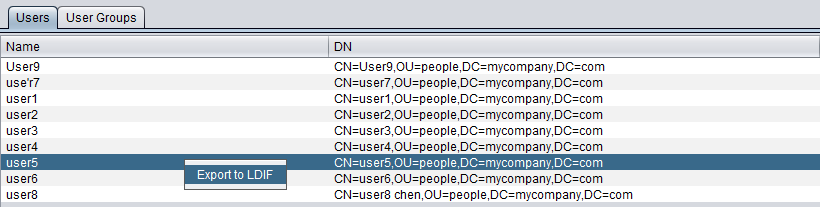 在User或者UserGroup列表中,右键单击选择 Export LDIF,就能获取当前对象的LDAP属性值。